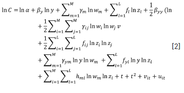 Assuming a specific functional form to define the production function, as was mentioned in the introduction, can be considered as one of the main drawbacks of the parametric approach. In particular, although the use of the Cobb-Douglas function is widespread due to its simplicity, it is prudent to try a more flexible specification such as the translog function. Thus, given that the actual functional form of costs is unknown, we use the general translog costs function: