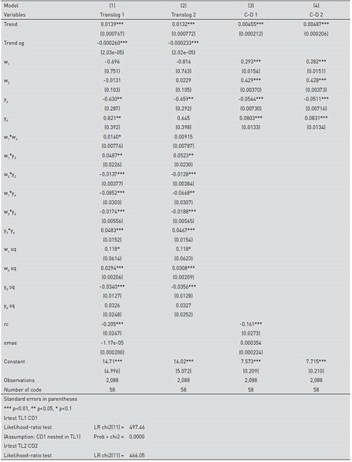 Table 4 presents the results for the estimated models. Translog models in both cases (with and without environmental variables) are preferred to Cobb-Douglas specifications according to the LR test. In the latter, both prices and outputs of the cost frontiers are significant. In the former, the linear terms for input prices are not significant, but square and interaction terms are significant in the translog with environmental variables and with a positive sign. Both linear coefficients for outputs are significant in the four specifications (with the exception of y6 in the translog without environmental variables). The negative sign for the linear coefficient of y2 is challenging; nevertheless, the full partial derivative of lnC with respect to y2 includes the quadratic and the interaction terms. Since environmental variables are significant, and the results of LR tests inform the same, the preferred specification is Model 1.
