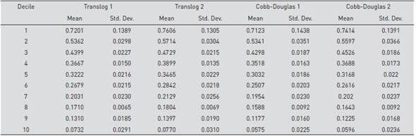 Table 6 presents the average efficiency of each decile of branches and its standard deviation according to each model. In this case, we can see that the first decile of branches in the selected model 1, achieves average values of 0.72 with a standard deviation of 0.13, while the tenth decile in the sample has average levels of 0.07 on average with a standard deviation of 0.03.
