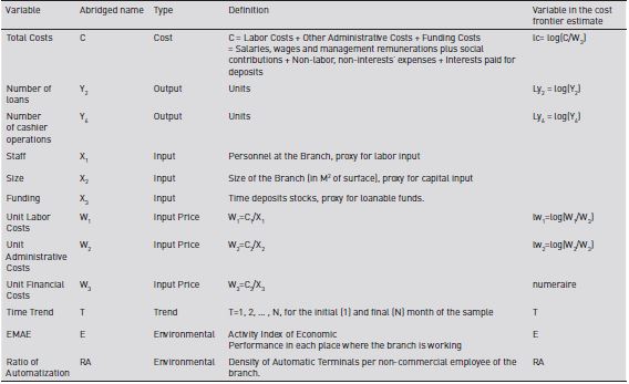 The inputs are labor (personnel), capital (proxied as the surface in m2 of each branch) and loanable funds. The input prices are the unit costs of labor, capital and loanable funds, the latter acting as the numeraire. A time trend and its square, because the model is a translog, were introduced, and two environmental variables were built to account for, the degree of automatization of the branch, and a monthly lead production indicator to account for the state of the economic cycle.