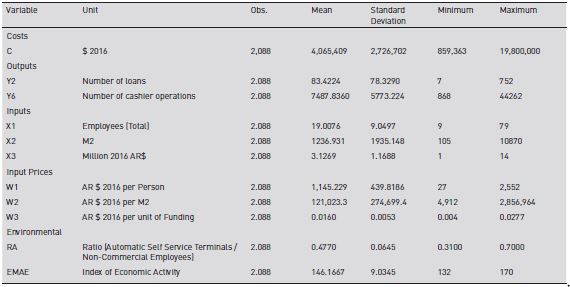 Table 2 describes the costs, outputs, inputs, input prices, time trend (to account- for seasonality), and environmental variables. We followed the literature consensus on variables to be included with the specificities of the case under study. All monetary variables were expressed in December 2016 prices, using as deflator the Construction Cost Index (ICC) estimated by the national statistics bureau (Instituto Nacional de Estadísticas y Censos, INDEC). Costs comprise labor, other administrative and loanable funds components. Outputs considered are number of loans and number of cashier operations (transactions).