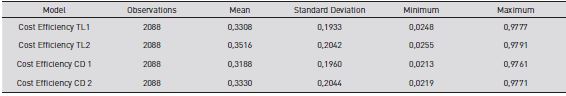 Table 5 presents the descriptive statistics of the efficiency results in each model.