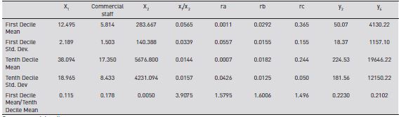 Table 6 shows the mean and standard deviation of output in the best and worst deciles of branches under model 1. The bottom line of the table is the quotient between both means. First, the first decile branches are smaller in terms of labor and non-labor inputs, and also in loans and transactions’ production.