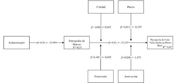 Los resultados del modelo de medición pueden ser observados en la figura 2 y los mismos muestran un alto po-der predictivo para las variables analizadas. Los resultados apoyan la H1 (β=0,50, p<0,01, t= 10,998, t > 1,28) y H2 (β =0,62, p<0,01, t= 15,105, t > 1,28). Este primer grupo de hipótesis refleja cómo el autoconcepto impacta a la autocogruencia sobre las marcas puertorriqueñas y el valor percibido de marcas que posean el sello “Hecho en Puerto Rico”.