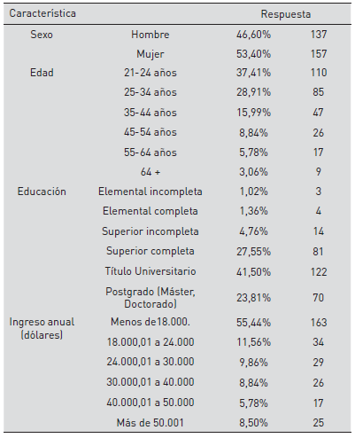 Esta investigación exploratoria de estilo transversal empleó la técnica cuantitativa a través de una encuesta para responder a las hipótesis planteadas. Para esto se aplicó un cuestionario a un total de 334 participantes, donde el criterio de participación es que fueran personas mayores de 21 años, tomen decisiones de compra, que sean puertorriqueños y residentes en Puerto Rico. Una vez aplicados los cuestionarios, se realizó una revisión inicial donde solo 294 cuestionarios fueron válidos para efectos de análisis, contando con una participación de 46,6% (n=137) de hombres y 53,40% (n=157) de mujeres. El perfil demográfico de los participantes puede ser observado en la tabla 1.