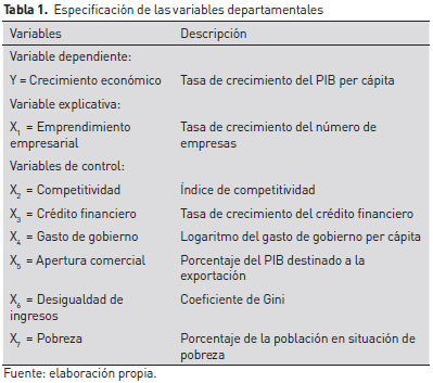 Para cumplir con el objetivo propuesto se efectuaron regresiones estadísticas múltiples de un modelo econométrico, en el que se consideró a la tasa de crecimiento anual del PIB per cápita departamental como variable dependiente, y a la tasa de crecimiento del número de empresas como variable explicativa. En la medida en que el crecimiento económico no depende sólo del emprendimiento empresarial, también se consideraron un conjunto de variables independientes relevantes en la condición de variables de control.