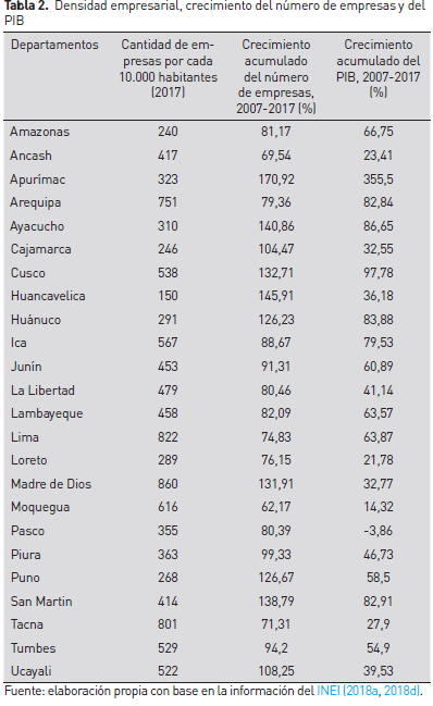 Se debe destacar un hecho interesante: los departamentos que ocupan los cinco primeros lugares en las tasas de crecimiento del número de empresas y el PIB están ubicados en la región de la Sierra. Si se tiene en cuenta que los cinco departamentos con la menor densidad empresarial también están localizados en esta región, ello pareciera indicar que en el período 2007 y 2017, la Sierra lideró el proceso de emprendimiento empresarial y el crecimiento económico partiendo desde una relativa baja dotación de empresas.