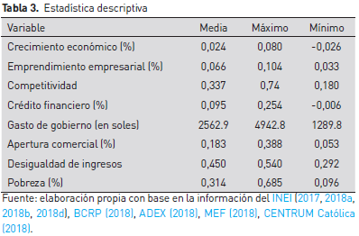 La información departamental sobre el PIB, el número de empresas, el coeficiente de Gini y la pobreza fueron recabadas del INEI. El dato sobre el crédito del sistema financiero se recopiló de los reportes estadísticos del Banco Central de Reserva del Perú (BCRP). Para el cálculo del grado de apertura comercial, la serie sobre las exportaciones fueron tomadas de los Boletines de Exportaciones Regionales publicados por la Asociación de Exportadores (ADEX). El valor del gasto de gobierno se extrajo del reporte sobre la ejecución presupuestal del Ministerio de Economía y Finanzas (MEF). El indicador del índice de competitividad departamental fue tomado de CENTRUM Católica (2018).