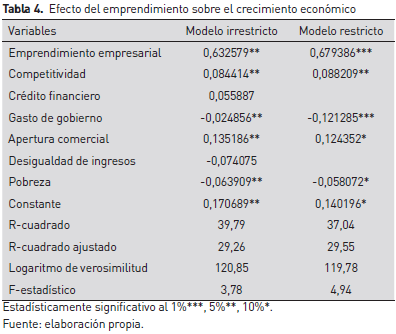 El cumplimiento de estos supuestos hace que el valor estimado del parámetro que mide el impacto del emprendimiento empresarial sobre el crecimiento económico (
