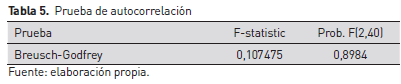 Si bien los datos utilizados en la regresión son tasas de crecimiento o valores promedio de sólo dos sub períodos (2007-2012 y 2013-2017), con la finalidad de determinar si hay algún grado de autocorrelación, se aplica el test de Breusch-Godfrey. Al respecto, en la tabla 5 se observa que la probabilidad del estadístico F es mayor a 0,05. Esto indica la ausencia del problema de autocorrelación, es decir, que los errores de ambos sub períodos no están correlacionados.