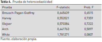 Dada la información de dos sub períodos, se evalúa la existencia del problema de heterocedasticidad, debido a que se trabaja con datos transversales correspondientes a 24 departamentos. La tabla 6 muestra que las cinco pruebas utilizadas presentan un estadístico F con una probabilidad mayor a 0,05, con lo que pone de manifiesto la inexistencia del problema de heterocedasticidad; es decir, se cumple con el supuesto de homocedasticidad (la varianza de los errores es constante) y, en consecuencia, los parámetros estimados son insesgados y eficientes.