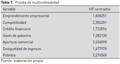 La multicolinealidad se evalúa mediante el test de Variance Inflation Factors (VIF). Al respecto, en la tabla 7 se observa que los valores VIF centrados de todas las variables explicativas consideradas en la regresión están muy por debajo de 10. Dicho resultado señala que no existe el problema de multicolinealidad, es decir, no hay relaciones lineales exactas entre las variables independientes del modelo.