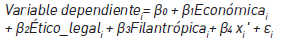 (1)Donde la variable dependiente corresponde a la variable posconflicto para la empresa i; β1, β2, β3 son los parámetros asociados a las variables de RSE; xi' es un vector columna conformado por las variables de control para la empresa i; β4 es el vector fila de parámetros correspondientes a estas variables; y εi es el término de error aleatorio del modelo.