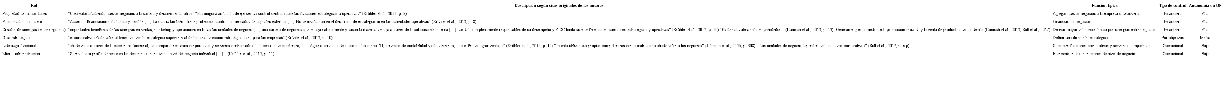 Los roles del CC, nombre que proponen Johnson et al. (2006), son gestor de portafolio, gestor de sinergias y promotor de desarrollo. El gestor de portafolio se enfoca en identificar y adquirir negocios infravalorados para mejorarlos y desinvertir en negocios de bajo rendimiento. El gestor de sinergias busca mejorar el valor de las UN al compartir recursos, actividades y conocimiento. El promotor de desarrollo se apalanca en los recursos y capacidades corporativas para agregar valor a las UN.