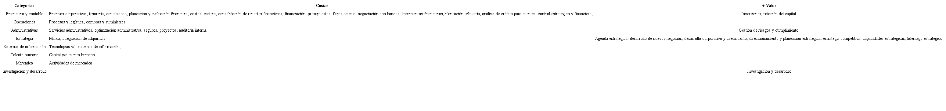 En la literatura revisada no se reconocieron criterios que faciliten la comparación entre las funciones. Por ejemplo, se presentan funciones financieras y de tesorería como categorías del mismo nivel, incluso, se listan junto con las funciones de planeación estratégica y de servicios compartidos. Es decir, en estas literaturas se observan diferentes niveles de agregación o detalle de las funciones. En la tabla 1, se presenta una variedad de funciones discrecionales que ejercen los CC. Aunque es posible crear mayor valor económico al reducir costos, en esta tabla se propone una diferenciación de las discrecionales más orientadas a la creación de nuevo valor de aquellas más orientadas a la disminución de costos.