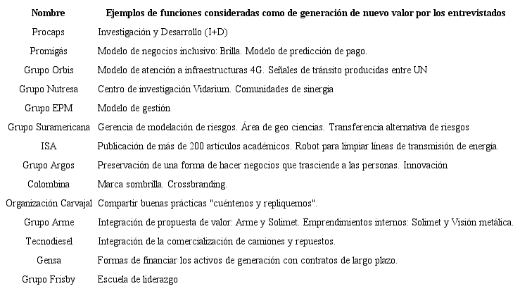 Las funciones de gestión externa mostraron ser relevan-tes y los altos directivos manifestaron dedicar gran parte de su tiempo a ellas. Esto es importante, sobre todo, en países de mercados emergentes en los que la inestabilidad institucional obliga a defender los derechos de propiedad y a promover un marco legal apropiado para los negocios (Londoño-Correa y Garzón, 2016). En relación con la gestión interna, más allá de las funciones de disminución de costos, que han sido más estudiadas por la literatura, se identificaron ejemplos de sinergias de conocimiento o de creación de nuevo valor a partir del fortalecimiento de capacidades estratégicas, generación de nuevas propuestas de valor y diseño de nuevos modelos de negocios. La generación de nuevo valor debe ser abordada en futuras investigaciones.