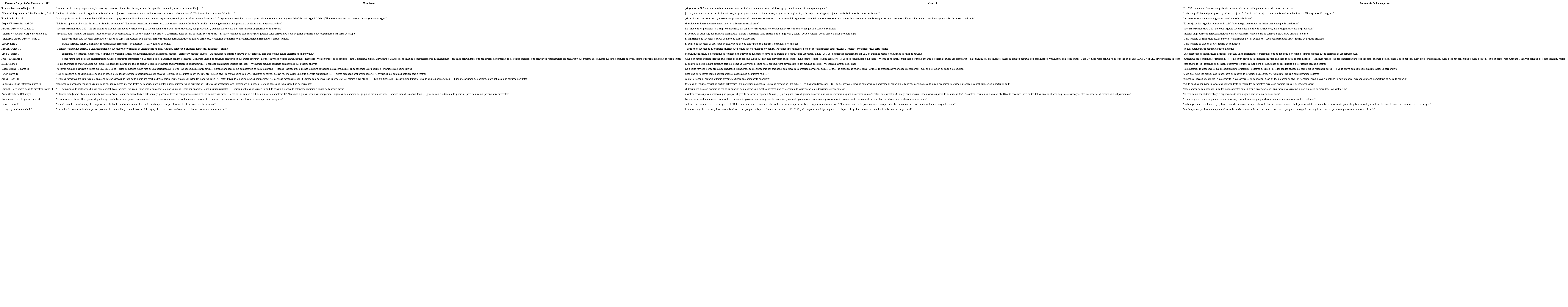 En la administración conjunta de las empresas estudia-das, se corroboró la existencia de funciones corporativas clasificadas en definición de portafolio, gestión externa y gestión interna (Londoño-Correa, 2003). La definición de portafolio es la función que da origen a la EMN, al pasar de uno a varios negocios. En este sentido, el negocio original puede crecer o escindirse para dar origen a nuevas UN. El crecimiento puede darse por emprendimiento interno o por adquisiciones totales o parciales. Así mismo, es posible que haya mayor o menor grado de relación entre el negocio original y los otros negocios de la EMN, pues las sinergias pueden materializarse por similitud o complementariedad (Larsson y Finkelstein, 1999). Las funciones de gestión externa, también nombradas en la literatura como estrategias de no mercado (Londoño-Correa y Garzón, 2016), mostraron ser tan relevantes como las de gestión interna. Sin embargo, Menz et al. (2015) reconocen que en la literatura de CC poco se ha profundizado sobre el tema. En las EMN estudiadas se destacó la prevalencia de la gestión externa. Una posible explicación para la importancia de esta función podrían ser los vacíos institucionales que se han reconocido como característica de países emergentes (Lamin, 2013; Manikandan y Ramachandran, 2015).