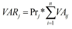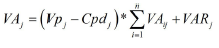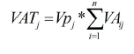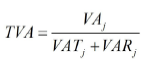 Tasa de valor agregado. En el presente trabajo se considera la tasa de valor agregado (TVAj) como la proporción que representa el valor real que se agrega a un producto, respecto a la suma del valor que se debía agregar al mismo y el de su recuperación si resultara defectuoso en dicho proceso. Algunos de los parámetros que comprenden su determinación se refieren a la unidad de producto; y otros, a un periodo de tiempo determinado. En este último caso, se toma el año como periodo analizado. El cálculo de TVA se realiza mediante las expresiones (1), (2), (3) y (4), en las que la TVA es la tasa de valor agregado total de la CS; VAj, el valor real agregado al producto j en unidades monetarias al año; VATj, el valor total que se debió agregar al producto j en unidades monetarias anuales; VARj es el valor agregado total al producto j reprocesados en unidades monetarias al año; Vpj es el volumen de producción del producto j en unidades de productos anuales; VAij, el valor agregado al producto j en el proceso i en unidades monetarias por unidad de producto; Cpdj, la cantidad de productos j defectuosos en unidades de productos anuales; Prj, la cantidad total de productos j recuperados en unidades de productos al año y n es la cantidad de procesos de la CS. Las expresiones para el cálculo de la TVA fueron diseñadas bajo el supuesto de que todo producto defectuoso será reprocesado desde el inicio de la CS.