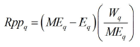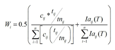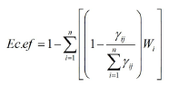 Una vez obtenida la ecoeficiencia de cada uno de los procesos, se calcula la ecoeficiencia de la CS a través de la expresión (10), Wi es el peso promedio del proceso i según componentes ambientales (expresión 11), n, cij y tij son términos ya explicados en las expresiones (3), (4) y (5), Iaij (T) es el impacto ambiental del proceso i al procesar el producto j en un periodo de tiempo T (suma de los impactos ambientales en cada una de las categorías) y tnij es el tiempo normado total para el proceso i en el producto j en unidades de tiempo por unidad de producto. El resultado de la ecoeficiencia fluctúa entre 0 y 1; aquí son deseables aquellos valores que más se aproximen al extremo superior.