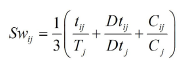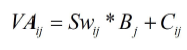 (4)Para calcular el VAij , se utilizó la metodología de Vinajera-Zamora, Marrero-Delgado y Ruiz-Morales (2017), reflejada en las expresiones (5) y (6). El término Swij expresa el peso específico promedio del proceso i en el producto j, es decir, el nivel de importancia de un proceso en el producto que se procesa. Constituye un valor promedio de la relación de tres parámetros esenciales, que son el costo agregado por el proceso i al producto j en unidades monetarias por unidad de producto (Cij), respecto al costo total de producto para toda la CS en las mismas unidades de medida (Cj); tiempo de elaboración del proceso i en el producto j en unidades de tiempo por unidad de producto (tij) respecto al tiempo del producto en la CS en iguales unidades de medida (Tj) y, por último, el tiempo de retraso promedio total del producto i en unidades de tiempo por unidad de producto (Dtij), respecto al tiempo total de retraso del producto en toda la CS en las mismas unidades (Dt). De esta forma, se considera el impacto del proceso más costoso, el que más demora y el que mayores atrasos provoca. El otro término empleado es Bj, que constituye el beneficio neto del producto j en unidades monetarias por unidad de producto.