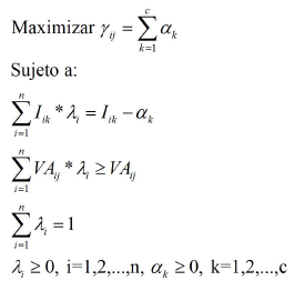 (9)En este modelo (9), la variable que se debe optimizar es el valor de la ecoeficiencia del proceso i en el producto j (γij) expresada en eco-puntos o puntos ambientales; las variables de decisión son la reducción de la categoría de impacto ambiental K para llegar a la ecoeficiencia αk en iguales unidades de medida, utilizando el Eco-indicador 99 y el vector de pesos del proceso i (λi). Por su parte, Iik es un parámetro de entrada que expresa el impacto ambiental del proceso i en la categoría ambiental k, n la cantidad de procesos y c cantidad de categorías de impacto ambiental.