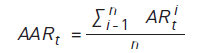Los retornos anormales promedio (AAR, por sus siglas en inglés de Average Abnormal Return) están definidos como la media aritmética de los retornos anormales a través de la submuestra de observaciones hipotéticas que tienen el mismo signo, en un tiempo específico con relación al evento (Kliger y Gurevich, 2014). Cuando el análisis se concentra en los retornos anormales promedio, esto puede ayudar a aumentar la relación señal-ruido (S/R) del precio de la acción que se está estudiando en el evento analizado. El promedio debería ser calculado sobre las observaciones cuyos rendimientos son hipotéticos y tienden a moverse en la misma dirección (Kliger y Gurevich, 2014). Siguiendo a Kliger y Gurevich (2014), el retorno anormal promedio queda definido en la ecuación 3.