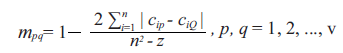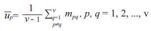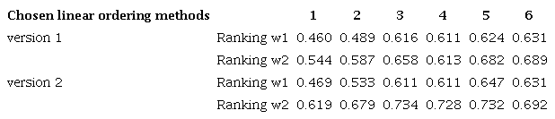 In order to determine the degree of similarity of the ranking obtained as a result of the application of the p-th linear ordering method to the other rankings, the sum of the elements p of row (or column) of the symmetric matrix M of dimensions (v × v) was calculated, where v is the number of rankings reduced by 1. Then the result was averaged as follows: