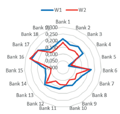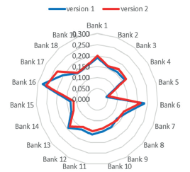 Although different assumptions were made for Option 1 and Option 2 for the Z6 variable, the results do not show major differences in the hierarchy of the three most resilient banks to potential COVID-19 effects and least resilient ones (Table 10 and Table 11). Banks N°5 and N°15 differ significantly from the others in their resistance level. Out of the 24 rankings performed, bank N°5 took last place 19 times, while bank N°15 was classified 7 times in the penultimate place and 4 times in the last. The situation is similar with the best banks. For example, bank N°16 was the highest ranked bank 15 times and 5 times it took second place. The results of the other 14 banks are no longer so clear since the positions occupied in the rankings are more diverse.