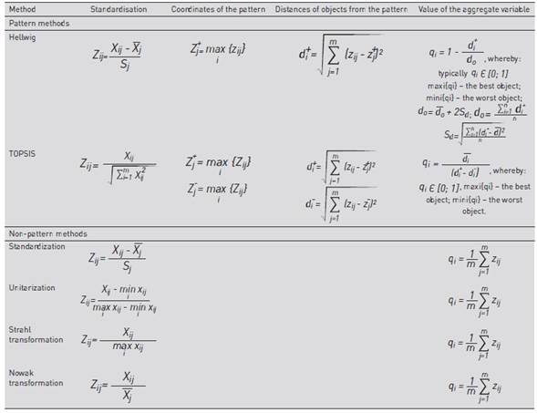The analysis was performed by using linear ordering methods based on a synthetic variable, which are included in Multiple-Criteria Decision Making (MCDM) techniques. Two pattern methods of variable aggregation − Hellwig (1968) and TOPSIS (Hwang & Yoon, 1981) − are based on determining the distance of individual objects from a defined model object. The other four techniques (Strahl, 1978, Nowak, 1977, Kukuła & Luty, 2015) are non-pattern ones. They consist in the operation of averaging the values of normalized variables. The designs of all aforementioned methods are presented in Table 2.