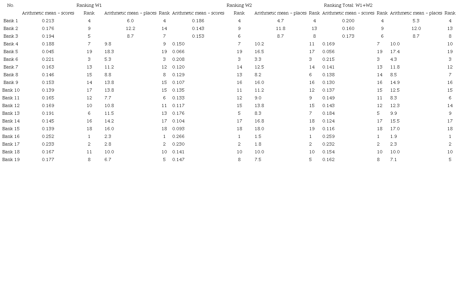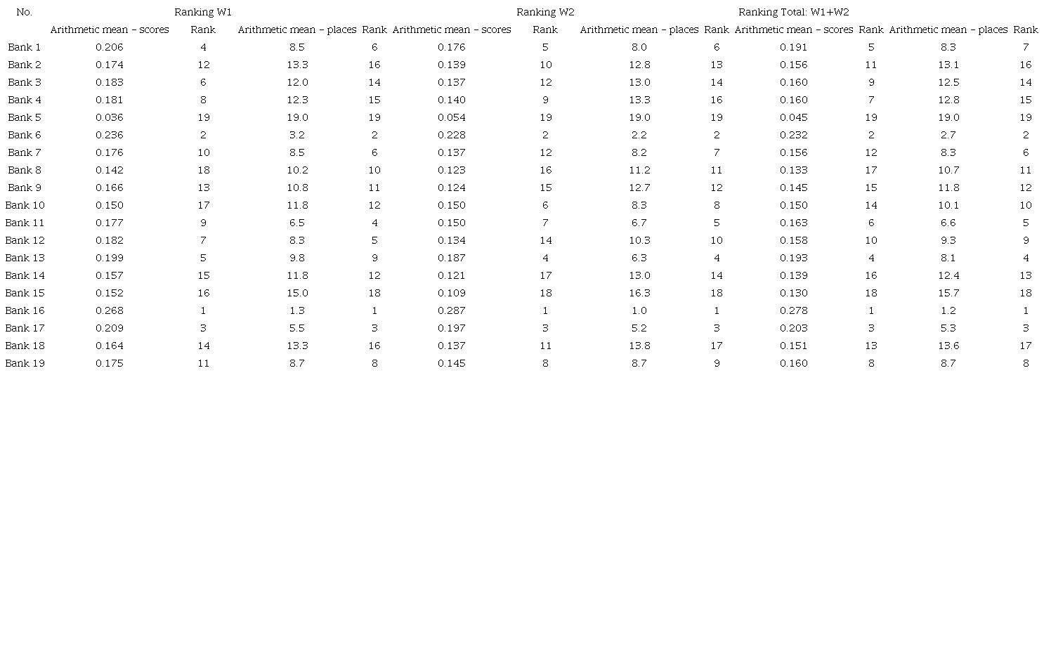 In this way, 24 rankings were obtained, which we-re used to build the final classification of banks (Table 8 and Table 9). The arithmetic mean of the grades obtained is presented in Figure 1 and Figure 2.