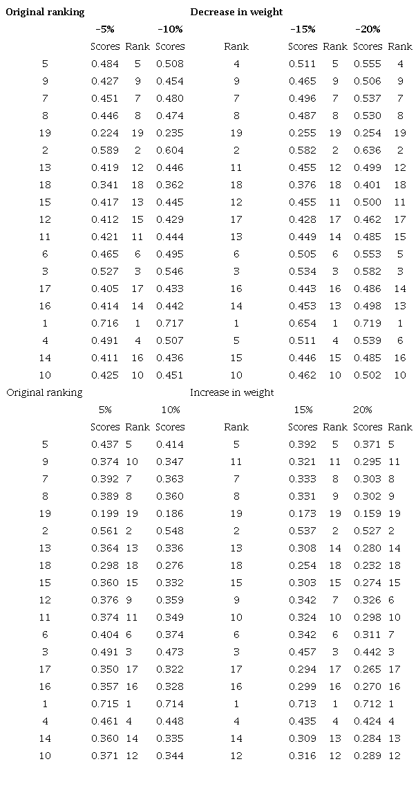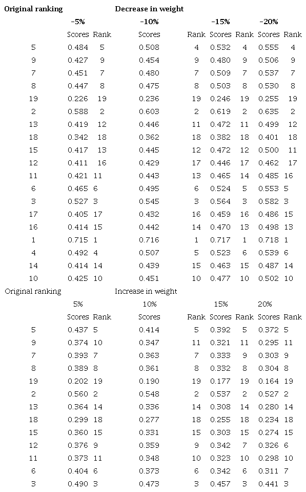 Additionally, in case of TOPSIS method, the sensitivity of the model was analysed due to its limitations in terms of weighting criteria. For this purpose, the method proposed by Moghassema and Fallahpour (2011) was used, which is based on decreasing and increasing all the weights of the criteria (5%, 10%, 15%, 20%) and repeating TOPSIS approach with new values: