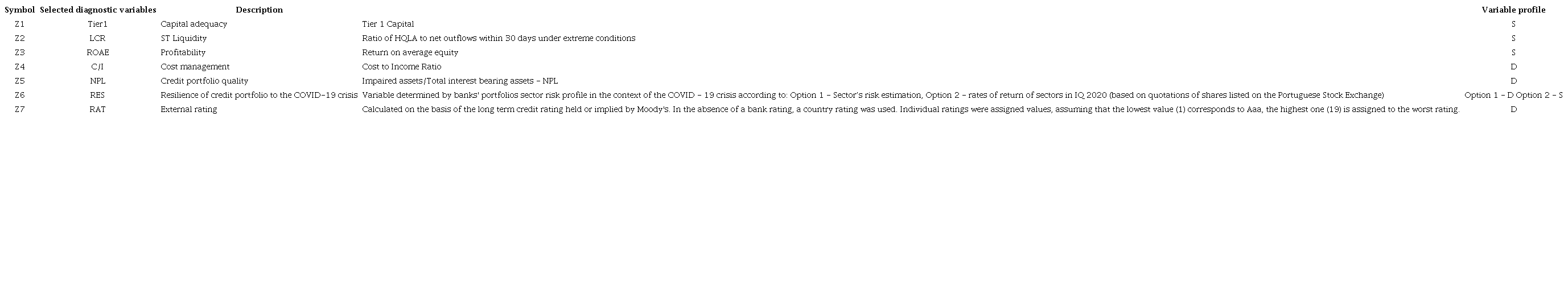 This research has many links with the study conducted by Korzeb and Niedziółka (2020) , however, in this case the Portuguese banking sector was chosen for the analysis, which in many aspects is the opposite of the Polish banking sector (functioning in the euro area, a significant number of small and medium-sized banks, greater industry specialization, smaller shareholding of the state, much larger share of COVID-19-sensitive sectors in the portfolios of large banks, greater internationalization of the banking sector in Portugal). Asking whether in Portugal the resistance of banks to the crisis is more dependent on the structure of the portfolio than on other determinants, it was decided to adjust the methodology to the formulated research questions, primarily by individualizing the construction of a set of explanatory variables, broadening the spectrum of linear ordering methods, analyzing the sensitivity of the obtained results and conducting a procedure aimed at selecting the optimal linear ordering method for the sample. The above actions are a far-reaching development of the concept described in Korzeb and Niedziółka (2020).