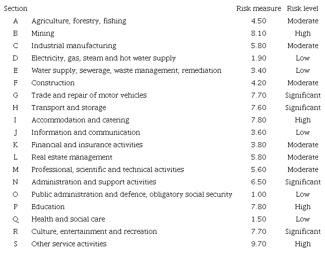 As in Korzeb and Niedziółka (2020) , the measure of risk of a specific sector was determined as a weighted average decile of the share of export in sales, import in operating costs and the expected decrease in sales revenues in 2020. The sectors were then ranked according to their risk and assigned the following designations: low risk (1st quartile), moderate risk (median), significant risk (3rd quartile), and high risk (last quartile) (Table 6).