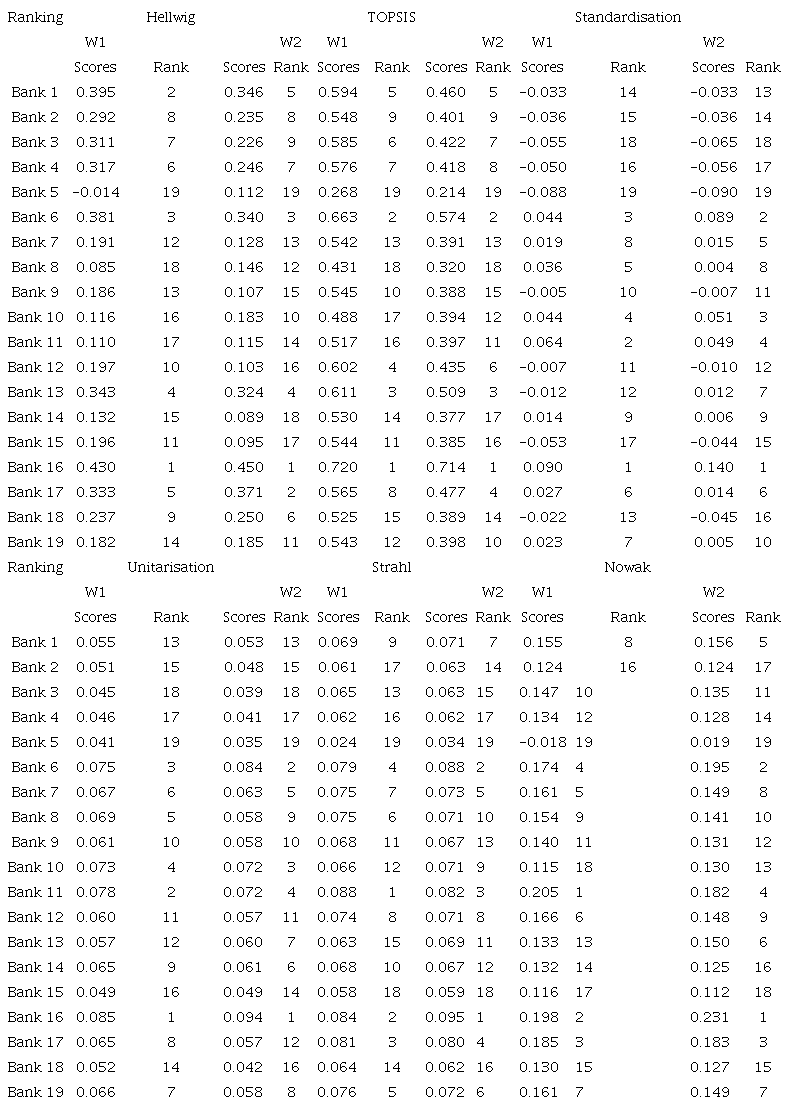 The sensitivity analysis of the TOPSIS ranking showed no significant differences (Tables 13, 14). Both the first three positions of the banks in the ranking and above all, the last two are unchanged in all adopted weights in both versions. Although some positions within the ranking change slightly, the correlations calculated using the Spearman and Kendall methods are very high (Table 15).