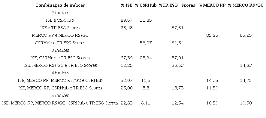 Quando se considera a combinação de três índices, constata-se que 67,39% das empresas integrantes do ISE no período também foram avaliadas externamente sob critérios de RSC tanto pela agência CSRHub, quanto pela agência Thomson. A menor proporção é identificada para empresas do ISE (12,25%) que também foram avaliadas externamente pelo ranking MERCO RS/GC e rating TR ESG Scores.