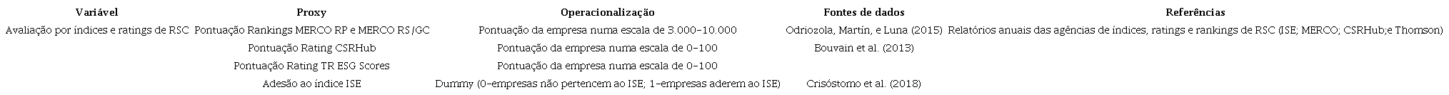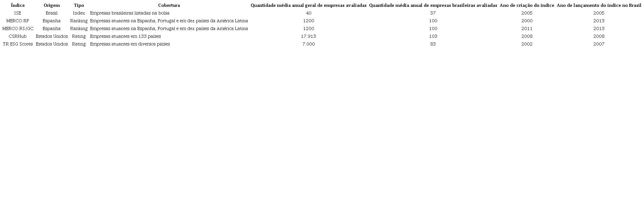 No contexto da empresa brasileira, têm emergido propostas de métricas que avaliam externamente aspectos de RSC de proporção relevante de empresas através de índices, rankings e ratings, como por exemplo: o Índice de Sustentabilidade Empresarial (ISE) no mercado de bolsa; os rankings Merco Empresas de Reputação Corporativa (MERCO RP) e Merco Responsabilidade e Governo Corporativo (MERCO RS/ GC) promovidos pelo MERCO; e os ratings fornecidos pela CSRHub e pela Thomson Reuters (TR ESG Scores), no contexto de agências internacionais. A Tabela 1 contém as principais informações que caracterizam cada um destes índices de RSC.