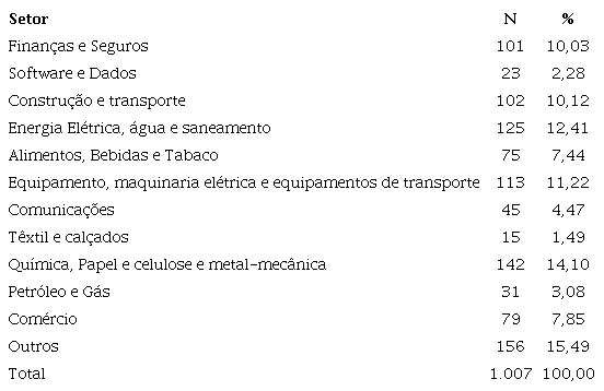 A amostra do estudo consiste em 1.007 observações no período 2013-2017, referentes a 275 empresas brasileiras avaliadas nos índices de RSC que são objeto deste estudo: ISE, MERCO RP, MERCO RS/GC, CSRHub e Thomson Reuters ESG Scores (TR ESG Scores). A Tabela 2 exibe a distribuição das empresas por setor de atividade econômica mostrando a alta diversidade de setores, o que é importante para o trabalho ao evitar viés devido a peculiaridades setoriais.