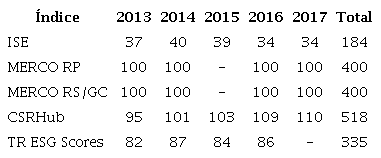 No que se refere à pontuação do desempenho de RSC, nota-se que apenas o ISE não oferece uma pontuação que quantifique individualmente o desempenho da empresa em RSC, ao contrário, limita-se à participação da empresa na carteira do ISE como critério que identifica compromisso socialmente responsável da empresa (Tabela 6, vi).