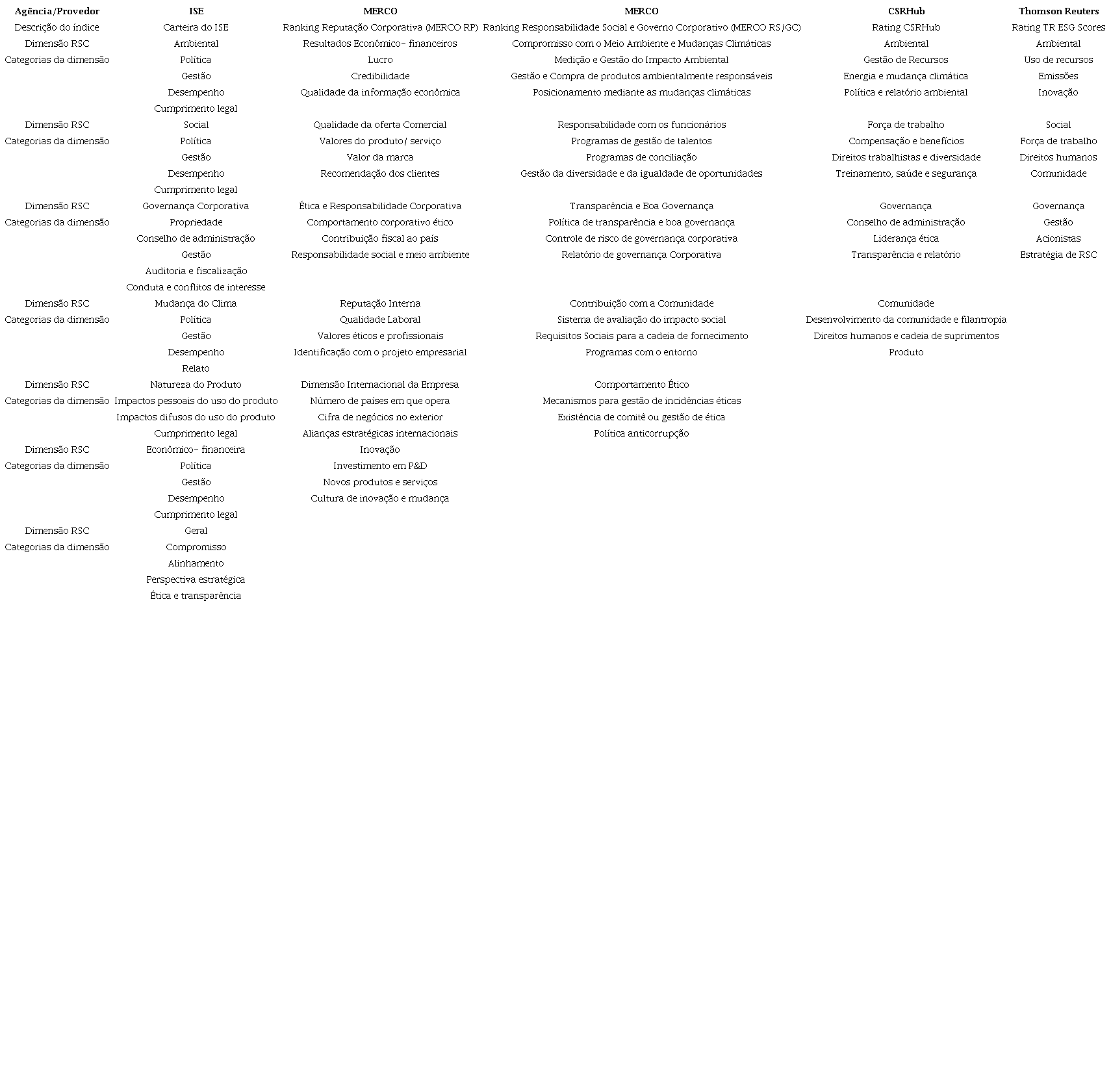 Realizou-se uma pesquisa detalhada sobre as metodologias de avaliação de RSC de cada um dos índices utilizados de modo a proceder-se a estudo comparativo entre eles. A Tabela 5 apresenta as dimensões de RSC levadas em consideração em cada um dos índices em questão.