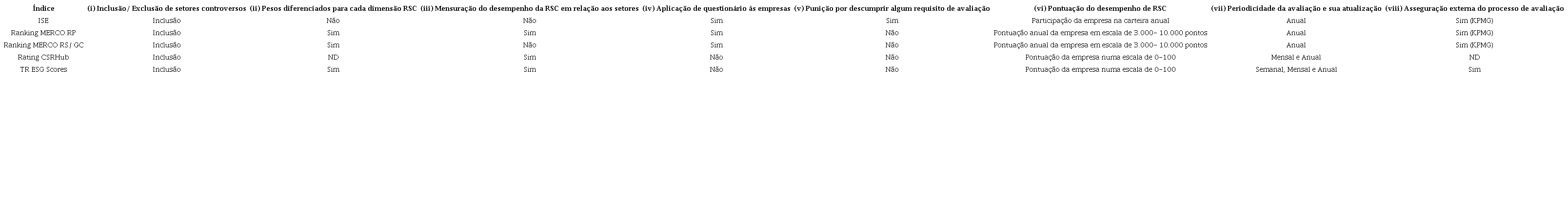 A Tabela 6 apresenta um comparativo das metodologias dos índices quanto aos critérios adotados no processo de avaliação e mensuração do desempenho em RSC. É possível constatar que todos os índices analisados não adotam critérios de exclusão de empresas de setores considerados controversos, procedimento conhecido na literatura por negative screen, que exclui tais setores por terem postura antiética, como os que alocam investimentos substanciais em produtos como tabaco, jogos de azar, álcool e armas de fogo (Tabela 6, i). Esta prática de negative screen foi adotada, por exemplo, pelo Instituto Brasileiro de Análises Sociais e Econômicas (IBASE, 2008).