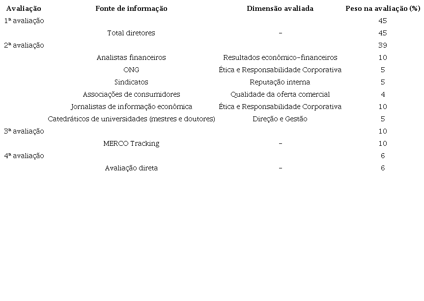 Diferentemente dos demais índices que ponderam as dimensões da RSC no processo de avaliação do desempenho socialmente responsável da empresa, na metodologia adotada pelos índices do MERCO, que é um monitor multi-stakeholder, a ponderação é efetivada com relação às quatro avaliações por meio da aplicação de questionários a nove fontes de informação, direcionadas a grupos específicos de stakeholders, conforme explicitado na Tabela 7.