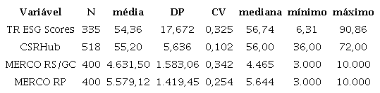 De uma forma geral, o coeficiente de variação (CV) de cada índice demonstra haver pouca variabilidade na amostra. O valor médio da pontuação em RSC da empresa pelo rating TR ESG Score aproxima-se do apresentado para o rating CSRHub.