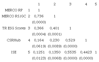 Os resultados permitem observar que todos os índices de RSC estão, de fato, positivamente correlacionados, a um nível de significância de 1%, para a maioria dos índices, de 5% para ISE e MERCO RP e de 10% para CSRHub e MERCO RP. Tais constatações indicam um forte indício de congruência na avaliação do desempenho em RSC da empresa brasileira por estes índices de avaliação de RSC como proposto pela hipótese deste trabalho. Este é um sinal positivo indicativo de consistência entre os índices que, apesar de apresentarem metodologias próprias, tendem a realizar avaliações que são confirmadas pelos demais.