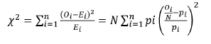 X2= valor del estadístico. Oi= número de observaciones del tipo i. N= número total de observaciones. Ei=Npi= la frecuencia esperada del tipo i, derivada de la hipótesis nula de que la fracción de i en la población es pi. n = número de celdas en la tabla.