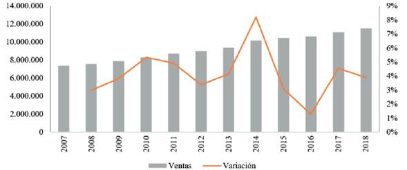 De igual manera, en la figura 1, se observa una tendencia de crecimiento promedio de las ventas de las empresas de alimentos en un 4,15% entre el período 2007-2018, lo que denota una alta demanda de estos bienes dentro del mercado y la importancia de este sector en la economía ecuatoriana; además, significaría que un incremento de las ventas en las empresas trae consigo un aumento en la cartera y una probabilidad de incumplimiento de las obligaciones de pago.