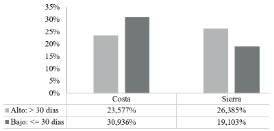 De la misma forma, en la figura 2 se aprecia que, del total de las empresas analizadas en la investigación, el 49,96% (26,38% en la Sierra y 23,58% en la Costa) presentan alto riesgo de crédito, mientras que el 50,04% de las firmas (19,10% en la Sierra y 30,94% en la Costa) están con bajo default crediticio.