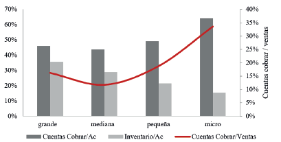 La figura 3 muestra la composición del activo corriente (Ac) por tamaño de empresas del sector; se observa que las microempresas poseen el 64,11% y el 33,60% de las cuentas por cobrar con respecto a la inversión total del activo y las ventas, respectivamente. De igual manera, en promedio, las cuentas por cobrar de las empresas representanta un 50,72% y un 20,06% de la inversión total de Ac y las ventas, respectivamente.