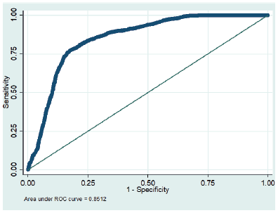 En la ejecución de la prueba de Wald, en la tabla 9, se evidencia que los coeficientes de las variables planteadas en el modelo son simultáneamente iguales a cero; se observa que el valor chi cuadrado es de 1296,52, con nueve grados de libertad, así como p < 0,05. De esta manera, se rechaza la hipótesis nula, lo que evidencia que incluir estas variables crea una mejora estadísticamente significativa en el ajuste del modelo. Por lo tanto, el modelo es adecuadamente predictivo, en buena medida, de las variables relacionadas. Por último, en el anexo (figura A1), se aprecia otra medida de bondad: la curva ROC, que muestra un área de 0,8512, por encima de 0,50, y evidencia que el modelo tiene un alto poder predictivo (Medina, 2008).
