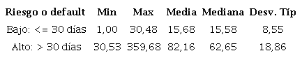 En este contexto, se estima como un rango de cobro oportuno un período de hasta 30 días, considerado como riesgo bajo con una media de 15,68 días, y más de 30 días como riesgo alto, con una media de 82,16 días y con la posibilidad de no recuperar los valores establecidos en el crédito.