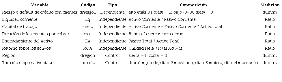 Posteriormente, se realizó una regresión logística para determinar la probabilidad de que una empresa tenga riesgo de default de crédito con clientes (alto o bajo riesgo); esta corroboró las hipótesis de investigación y a su vez se examinaron las relaciones causales y la probabilidad de ocurrencia de estar en riesgo o default. De esta manera, los modelos de regresión logística permiten conocer la relación entre la variable dependiente dicotómica riesgo o default de crédito con clientes (alto = 1 y bajo = 0) y las variables explicativas independientes o covariables definidas en la investigación. La función lineal resultante es el logaritmo de: